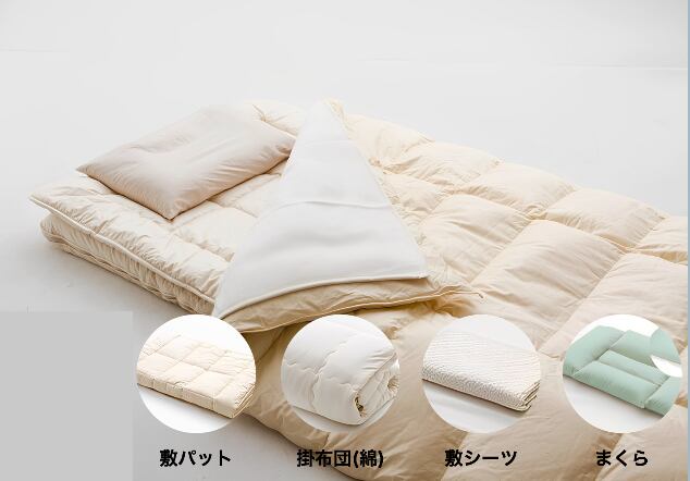 素 材:敷パット:表地・裏地綿100%、詰め物毛100%/掛布団:側地綿100%、詰めものピマ綿100%/パットシーツ:脱脂綿・ガーゼ/まくら:側地:綿100%/詰め物:そばがら/ファスナー:YKK製のファスナーを使用しております。